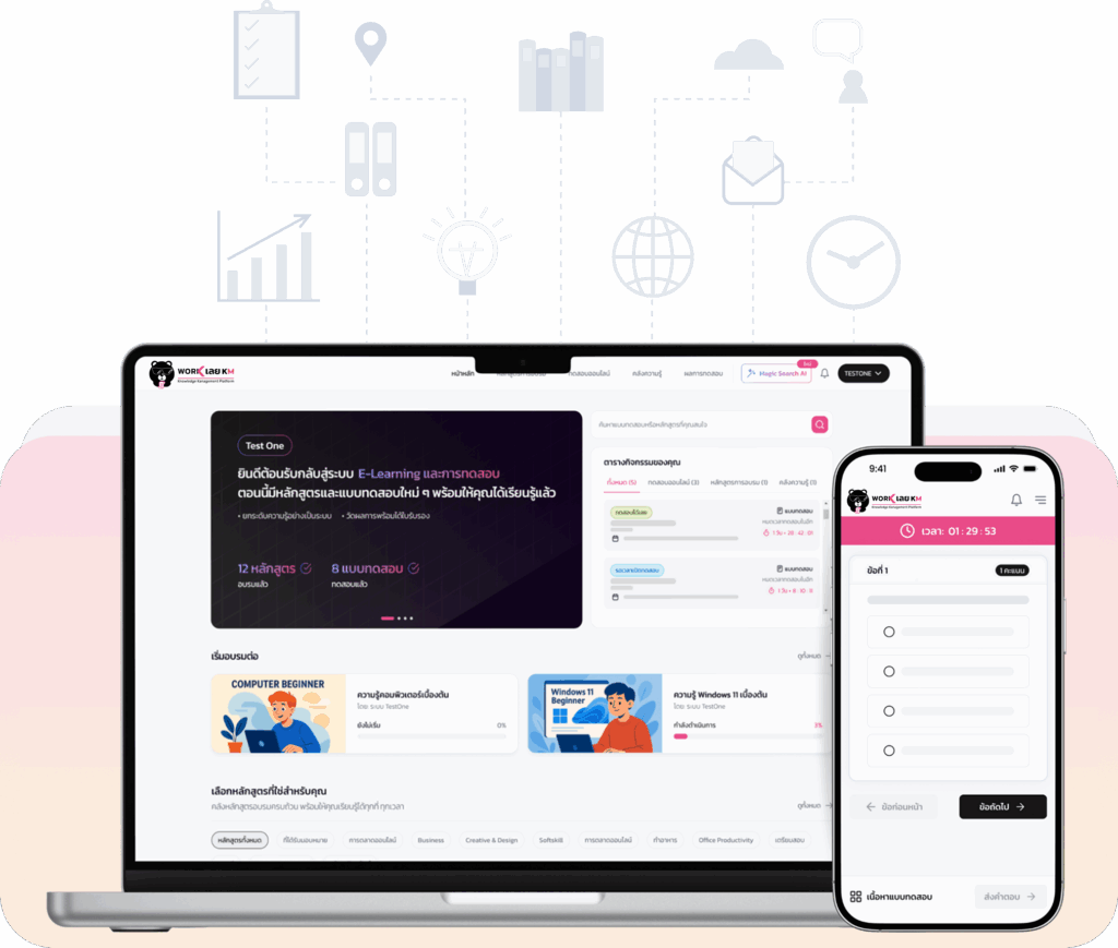 หมดปัญหาเอกสารกองโต การตรวจข้อสอบทีละชุด รวมถึงการประสานงานที่วุ่นวาย Workเลย KM ช่วยเปลี่ยนความยุ่งยากเหล่านี้ให้เป็นเรื่องง่าย ครอบคลุมทุกมิติ เพื่อให้องค์กรของคุณ ประหยัดเวลา ลดต้นทุน และเพิ่มประสิทธิภาพ ได้อย่างแท้จริง